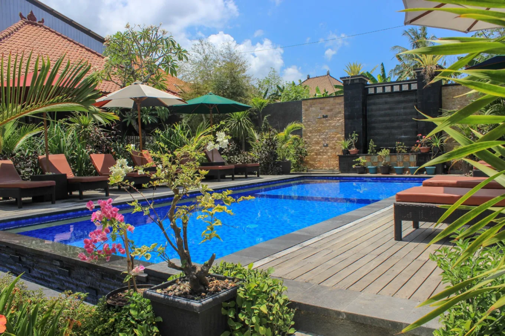 Cozy wooden huts, closer to traditional bungalows, sprinkled in a Balinese garden surrounding a mid-size swimming pool. Minimalist, yet with welcoming warmth, this simple accommodation is great for families.